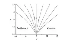 où rt est la variation de densité en fonction du temps, x est la densité de population, y est le taux de croissance intrinsèque, K représente la capacité de charge et C la taille limite de population viable.
