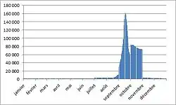 Nombre de contrats vendanges selon le mois en 2009 (Source : INSEE[11]).