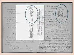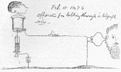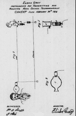 Deux ans plus tard, le , Gray inclut pourtant pour la première fois un schéma relatif à la première utilisation d'un téléphone (schéma à gauche) et trois jours plus tard, le , l'avocat d'Elisha Gray dépose un brevet descriptif (en) (« caveat ») c'est-à-dire un avis d’intention de dépôt de brevet interdisant pour un an la reconnaissance de droits à toute autre personne pour la même invention[1], correspondant à un schéma similaire au premier (schéma ci-contre à droite).