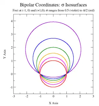Cette équation montre que σ et τ sont respectivement les parties réelle et imaginaire d'une fonction analytique de x + iy (avec des points de branchement logarithmiques aux foyers), ce qui prouve (selon la théorie générale des transformations conformes) (les équations de Cauchy-Riemann) que ces courbes de σ et τ sont des faisceaux orthogonaux, et forment donc bien un système de coordonnées orthogonales.