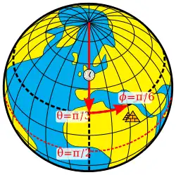 La colatitude et la longitude seront désignées désormais respectivement par les lettres θ et φ (mais on verra plus bas que ces lettres sont parfois interverties). La latitude est le plus souvent notée δ.