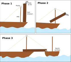 Certains engins de siège utilisés dans l’Antiquité ou au Moyen Âge, comme la tour de siège, étaient équipés à leur sommet d’une passerelle basculante dont le principe était voisin de celui du corbeau.