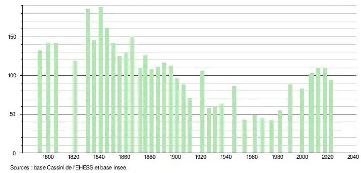 L'évolution du nombre d'habitants est connue à travers les recensements de la population effectués dans la commune depuis 1793. Pour les communes de moins de 10 000 habitants, une enquête de recensement portant sur toute la population est réalisée tous les cinq ans, les populations de référence des années intermédiaires étant quant à elles estimées par interpolation ou extrapolation[16]. Pour la commune, le premier recensement exhaustif entrant dans le cadre du nouveau dispositif a été réalisé en 2007[17].