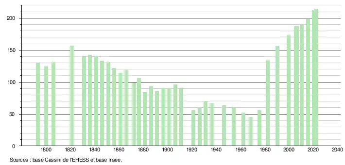 L'évolution du nombre d'habitants est connue à travers les recensements de la population effectués dans la commune depuis 1793. Pour les communes de moins de 10 000 habitants, une enquête de recensement portant sur toute la population est réalisée tous les cinq ans, les populations de référence des années intermédiaires étant quant à elles estimées par interpolation ou extrapolation[21]. Pour la commune, le premier recensement exhaustif entrant dans le cadre du nouveau dispositif a été réalisé en 2005[22].