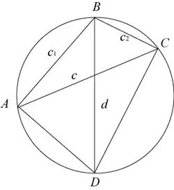 Formule des cordes consécutives : Soient trois points d'un cercle de diamètre , et étant situés de part et d'autre du diamètre issu de . Par application du théorème de Ptolémée, Les longueurs des cordes sont reliées par la relation [1].