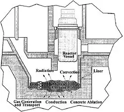 Un scénario catastrophe surnommé « syndrome chinois » envisage le cas où le corium perce ou fait exploser sous la pression le bâtiment réacteur puis s'enfonce dans le sol, brisant la troisième et ultime barrière de protection et se répandant dans le milieu naturel.