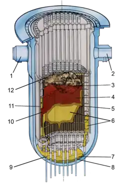 Un incident sur les pompes principales d'alimentation en eau du circuit secondaire de la centrale nucléaire de Three Mile Island le a conduit, à la suite de nombreuses défaillances et erreurs, à la formation d'une bulle de vapeur dans le haut du cœur du réacteur de 900 MW électriques (2 722 MW thermiques) mis en service commercial trois mois plus tôt. Cette bulle privant de refroidissement le haut des éléments combustibles pendant plusieurs heures, environ 45 % du cœur fondit et forma un corium qui coula au fond de la cuve[9]. Selon l'IRSN, le combustible avait commencé à fondre moins de 3 heures après le début de l'accident [10]. La cuve ne fut pas percée et le bâtiment du réacteur a joué son rôle d'ultime barrière de confinement. La seule contamination extérieure à déplorer s'est produite à la suite d'erreurs de manutention d'effluent liquide.