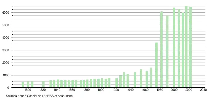 L'évolution du nombre d'habitants est connue à travers les recensements de la population effectués dans la commune depuis 1793. Pour les communes de moins de 10 000 habitants, une enquête de recensement portant sur toute la population est réalisée tous les cinq ans, les populations de référence des années intermédiaires étant quant à elles estimées par interpolation ou extrapolation[28]. Pour la commune, le premier recensement exhaustif entrant dans le cadre du nouveau dispositif a été réalisé en 2006[29].