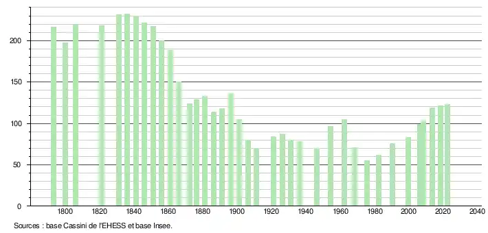 L'évolution du nombre d'habitants est connue à travers les recensements de la population effectués dans la commune depuis 1793. Pour les communes de moins de 10 000 habitants, une enquête de recensement portant sur toute la population est réalisée tous les cinq ans, les populations de référence des années intermédiaires étant quant à elles estimées par interpolation ou extrapolation[19]. Pour la commune, le premier recensement exhaustif entrant dans le cadre du nouveau dispositif a été réalisé en 2008[20].