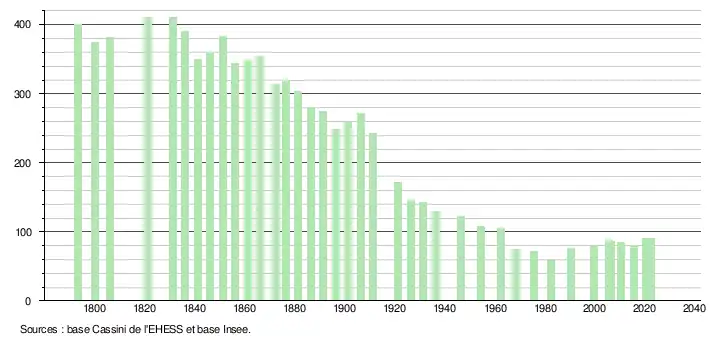 L'évolution du nombre d'habitants est connue à travers les recensements de la population effectués dans la commune depuis 1793. Pour les communes de moins de 10 000 habitants, une enquête de recensement portant sur toute la population est réalisée tous les cinq ans, les populations de référence des années intermédiaires étant quant à elles estimées par interpolation ou extrapolation[20]. Pour la commune, le premier recensement exhaustif entrant dans le cadre du nouveau dispositif a été réalisé en 2005[21].
