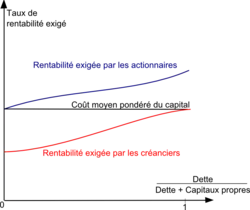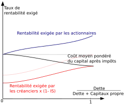 Les autres apporteurs de capitaux sont les créanciers, dont l’exigence de rendement est le taux d’intérêt de la dette. Le taux d’intérêt est normalement inférieur à la rentabilité exigée des actionnaires dans la mesure où les créanciers se « servent » avant les actionnaires, et font donc un placement beaucoup moins risqué. Le taux d’intérêt est par ailleurs réduit du taux d’imposition des sociétés, les intérêts étant déductibles.