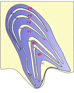 - 5. Les six couches présentent de nettes différences cytoarchitectoniques. Les neurones des deux couches inférieures, numérotées 1 et 2, ont des axones d'un calibre bien plus gros que ceux des neurones des couches supérieures (3, 4, 5, 6), eux-mêmes plus gros que ceux des sous-couches ventrales[6].