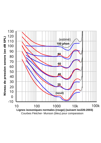 Le graphique à droite indique les courbes isosoniques de Fletcher et Munson, c'est-à-dire la sensibilité moyenne de l'oreille en fonction de la fréquence (en hertz) et du niveau sonore (en dB SPL). Elles montrent que la sensibilité de l'oreille varie fortement suivant la pression sonore.