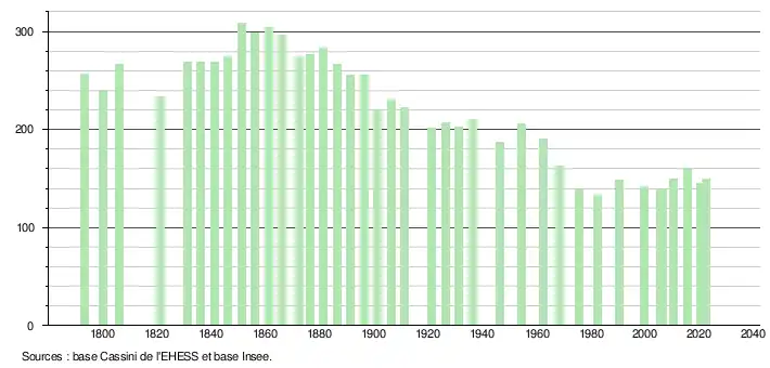 L'évolution du nombre d'habitants est connue à travers les recensements de la population effectués dans la commune depuis 1793. Pour les communes de moins de 10 000 habitants, une enquête de recensement portant sur toute la population est réalisée tous les cinq ans, les populations de référence des années intermédiaires étant quant à elles estimées par interpolation ou extrapolation[20]. Pour la commune, le premier recensement exhaustif entrant dans le cadre du nouveau dispositif a été réalisé en 2005[21].