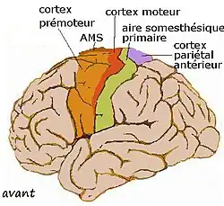 - l'aire motrice supplémentaire (AMS) qui coordonne et planifie les gestes complexes impliquant une séquence de mouvements ou la coordination de plusieurs membres. L'AMS est située en avant du cortex moteur, sur la face interne des deux hémisphères,