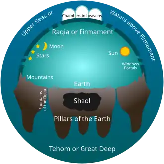 La Torah imaginait un monde en trois parties, avec les cieux (shamayim) au-dessus, la terre (eres) au milieu, et le monde souterrain (shéol) dessous[22]. Après le IVe siècle av. J.-C., ce concept fut peu à peu remplacé par le principe cosmologie scientifique grec d'une terre sphérique entourée par de multiples cieux concentriques[23].