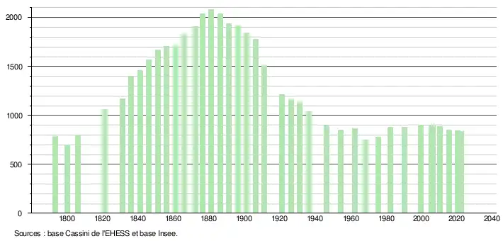 L'évolution du nombre d'habitants est connue à travers les recensements de la population effectués dans la commune depuis 1793. Pour les communes de moins de 10 000 habitants, une enquête de recensement portant sur toute la population est réalisée tous les cinq ans, les populations de référence des années intermédiaires étant quant à elles estimées par interpolation ou extrapolation[16]. Pour la commune, le premier recensement exhaustif entrant dans le cadre du nouveau dispositif a été réalisé en 2005[17].