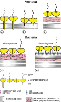 Illustration schématique de l'architecture supramoléculaire des principales classes d'enveloppes cellulaires procaryotes contenant des couches de surface (S). Les couches S des archées, dont la paroi est exclusivement constituée de réseaux de glycoprotéines, sont composées soit de sous-unités en forme de champignon avec des domaines transmembranaires hydrophobes en forme de piliers (a), soit de sous-unités de glycoprotéines modifiées par des lipides (b). Les couches S individuelles peuvent être composées de glycoprotéines possédant les deux types de mécanismes d'ancrage membranaire. Peu d'archées possèdent une couche de paroi rigide (par exemple la pseudomuréine chez les organismes méthanogènes) comme couche intermédiaire entre la membrane plasmique et la couche S (c). Chez les bactéries à Gram positif (d), les (glyco)protéines de la couche S sont liées à la couche rigide contenant du peptidoglycane par des polymères secondaires de la paroi cellulaire. Chez les bactéries à Gram négatif (e), la couche S est étroitement associée au lipopolysaccharide de la membrane externe. La figure et sa légende ont été copiées de Sleytr et al., 2014[2].