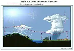 - Le réchauffement diurne se passant près du sol, la couche limite planétaire forme un « bouchon » qu'il faut vaincre pour générer des nuages convectifs de la famille des cumulus (cumulus, cumulus congestus et cumulonimbus). En effet, le sommet de la couche limite est le plus souvent associé avec le niveau de condensation par ascension (NCA) et la base des nuages. Le niveau de convection libre (NCL), qui détermine le début de la convection et l'extension verticale d'un nuage convectif, peut cependant être légèrement plus élevé (voir : Détermination de la base des cumulus)[8],[10]. La coïncidence entre la base des nuages et le sommet de la CLA est cependant tributaire d'une masse d'air normalement humide, dans une région plus aride, les nuages pourrait se former à plus haute altitude que la CLA (le NCA étant difficile à atteindre) ;