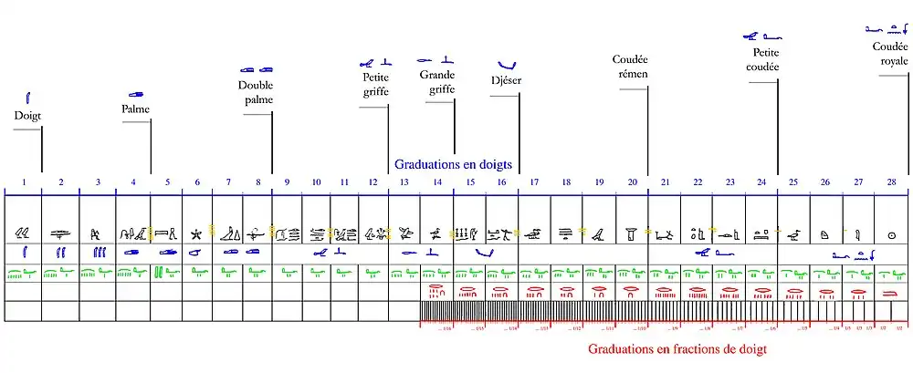 La coudée royale est l'étalon d'un système de mesure, appelé système digital[note 1], se déclinant en doigt, palme (quatre doigts), main (cinq doigts), petit empan (trois palmes), grand empan (trois palmes et demi)[4].