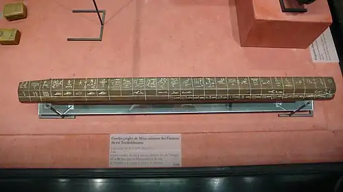 Une coudée, découverte en bon état à Memphis, est conservée aux Musées royaux de Turin. Sa longueur, mesurée avec soin en 1814 par les savants italiens de l'Académie Royale de Turin Georges Bidone et Giovanni Antonio Amedeo Plana, est d'environ 52,35 cm[20].