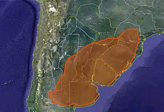 - Argentine : les provinces de Buenos Aires, Santa Fe, Córdoba, San Luis, Entre Ríos, Santiago del Estero, Chaco, Formosa, Corrientes, Missions, nord de La Pampa et de Río Negro, Mendoza, San Juan, La Rioja, Catamarca, Tucuman, Saute et Jujuy, ainsi que Buenos Aires ;