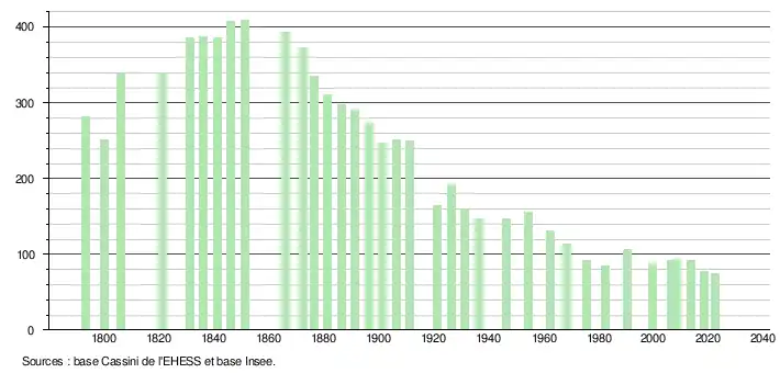 L'évolution du nombre d'habitants est connue à travers les recensements de la population effectués dans la commune depuis 1793. Pour les communes de moins de 10 000 habitants, une enquête de recensement portant sur toute la population est réalisée tous les cinq ans, les populations de référence des années intermédiaires étant quant à elles estimées par interpolation ou extrapolation[19]. Pour la commune, le premier recensement exhaustif entrant dans le cadre du nouveau dispositif a été réalisé en 2008[20].
