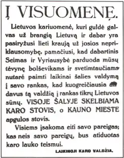 Après les élections de mai, le gouvernement Grinius/Sleževičius lève la loi martiale encore en vigueur en Kaunas et dans d'autres localités, rétablit les libertés fondamentales et accorde l'amnistie aux prisonniers politiques : la Lituanie devient alors un pays vraiment démocratique pour la première fois[10]. Ces changements ne sont pas unanimement salués. Profitant du rétablissement de la liberté de parole, des prisonniers politiques libérés (en grande partie des communistes) organisent une manifestation à Kaunas le 13 juin, réunissant environ 400 personnes avant d'être dispersée[9]. L'opposition s'en saisit pour accuser le gouvernement de permettre à des organisations illégales comme le Parti communiste de Lituanie de poursuivre leurs activités en toute impunité. Malgré son caractère local, l'incident est présenté comme une menace pour la Lituanie et ses armées, et le gouvernement comme incapable de lutter contre cette menace[9].