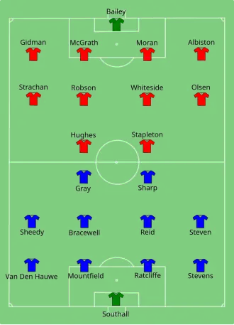 | Finale de la Coupe d'Angleterre 1985 | Everton | 0 – 1 (a.p) | Manchester United | Wembley, Londres | |||||||||||||||||||||||||||||||||||||||||||||||