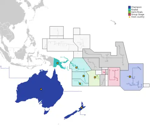 L'Australie (du temps de sa présence dans la confédération) et la Nouvelle-Zélande ont toujours été qualifiées d'office pour le tournoi, tandis que les nations restantes ont, à partir de 1996, très souvent dû passer par une phase qualificative. Les coupes polynésienne et mélanésienne, disputées localement entre cinq nations chacune, ont notamment servi un temps de tournois de qualification pour la coupe d'Océanie des nations.