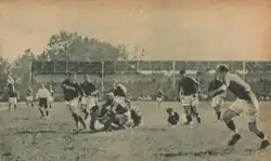 Après des minutes d'observations entre les deux équipes avec une ample distribution de coups de pied et de nombreuses interventions de l'arbitre anglais M. Dobson, le R.C. Roanne décide d’accélérer le jeu au quart d'heure sur une sortie de mêlée par Joseph Griffard lançant idéalement Joseph Carrère à l'essai transformé ensuite par Léopold Servole. Quelques instants plus tard, Robert Dauger fait une percée et laisse Charles Lamarque scorer l'essai[23]. Le S.A. Villeneuveest dépassé à ce moment-là du match et ne peut éviter dans l'enchaînement des évènements l'ailier roannais Jean Bellan, qui se joue de la défense adverse pour remettre au puissant Henri Gibert qui va de son essai transformé par Servolle. Le score est alors de 13-0 pour le R.C. Roanne avant que l'arrière villeneuvois Marius Guiral vienne ouvrir le score de son côté par une pénalité et conclure cette première mi-temps à 13-2 à l'avantage du R.C. Roanne[23].