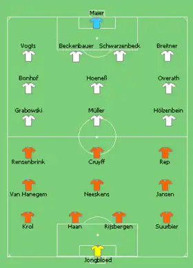À la 26e minute de jeu, l'ailier gauche allemand Bernd Hölzenbein dribble trois adversaires dans la surface de réparation mais le troisième, Wim Jansen, le tacle irrégulièrement. Les Allemands obtiennent un penalty, qui est transformé par le défenseur Paul Breitner. Après cette égalisation, l'équipe allemande domine la rencontre et se procure de bonnes occasions de but par Franz Beckenbauer sur coup franc ainsi que par Berti Vogts et Jürgen Grabowski. Le Néerlandais Johnny Rep échoue seul devant le gardien Sepp Maier à la 37e minute. Peu avant la mi-temps, un centre de la droite de Rainer Bonhof arrive dans le dos de Gerd Müller, marqué par deux défenseurs. Müller se retourne vers la balle, la fait ricocher sur son pied gauche, se retourne vers le but et trompe le gardien néerlandais Jan Jongbloed[8],[17] pour offrir un deuxième but à l'Allemagne de l'Ouest : 2-1[16]. L'Allemagne conserve son avantage au score lors de la seconde période dominée par les Néerlandais, et remporte sa deuxième Coupe du monde après celle de 1954.
