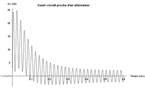 - l'établissement du courant de court-circuit est complexe, et sa forme et les amplitudes atteintes dépendent fortement de l'instant où s'est produit le court-circuit. Le régime transitoire est encore plus complexe, quand un générateur est proche de l'endroit du défaut ;