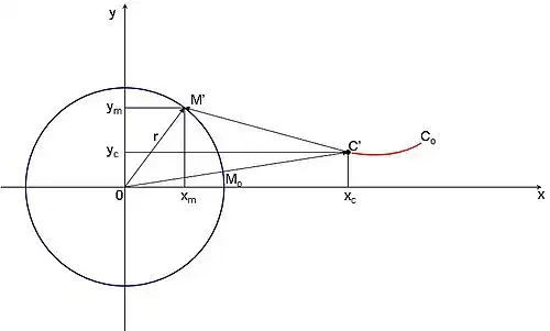 Il s’agit d’établir l'équation de la trajectoire de poursuite que parcourt un chien lorsque son maître, éloigné, l'appelle tout en se déplaçant sur une trajectoire circulaire. On conviendra que le maître se déplace de façon uniforme à la vitesse « v » et dans le sens trigonométrique. Le chien accourt à une vitesse « kv » et de façon à être, à tout moment, dirigé vers son maître. Au bout du temps « t » on convient que le maître s’est déplacé de « Mo » à « M' », c'est-à-dire d’un angle « ω = vt/r »
