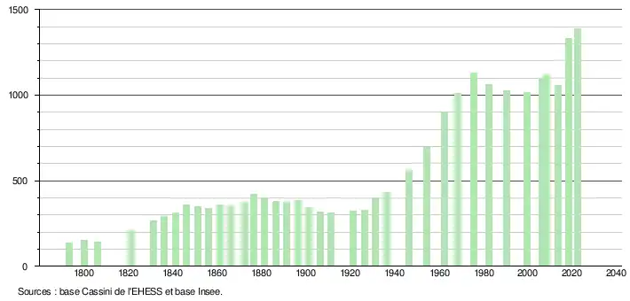 L'évolution du nombre d'habitants est connue à travers les recensements de la population effectués dans la commune depuis 1793. Pour les communes de moins de 10 000 habitants, une enquête de recensement portant sur toute la population est réalisée tous les cinq ans, les populations de référence des années intermédiaires étant quant à elles estimées par interpolation ou extrapolation[18]. Pour la commune, le premier recensement exhaustif entrant dans le cadre du nouveau dispositif a été réalisé en 2008[19].