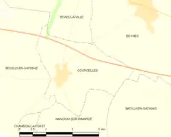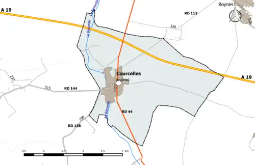 Carte de la commune de Courcelles (Loiret) et des communes limitrophes.