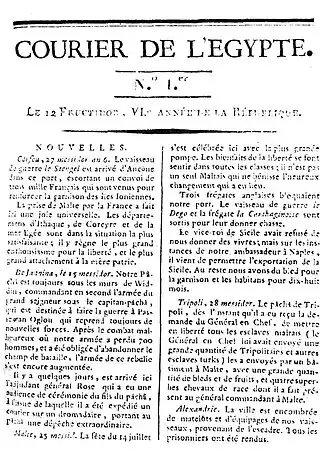 - ↑ Courier est écrit avec un seul r ; les numéros 9, 10 et 12 à 17 s'intitulaient le Courrier de l'Égypte (avec deux r à Courrier).