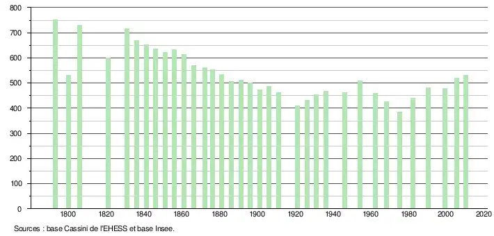 - ↑ Par convention dans Wikipédia, le principe a été retenu de n’afficher dans le tableau des recensements et le graphique, pour les populations légales postérieures à 1999, que les populations correspondant à une enquête exhaustive de recensement pour les communes de moins de 10 000 habitants, et que les populations des années 2006, 2011, 2016, etc. pour les communes de plus de 10 000 habitants, ainsi que la dernière population légale publiée par l’Insee pour l'ensemble des communes.