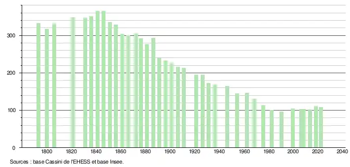 L'évolution du nombre d'habitants est connue à travers les recensements de la population effectués dans la commune depuis 1793. Pour les communes de moins de 10 000 habitants, une enquête de recensement portant sur toute la population est réalisée tous les cinq ans, les populations de référence des années intermédiaires étant quant à elles estimées par interpolation ou extrapolation[27]. Pour la commune, le premier recensement exhaustif entrant dans le cadre du nouveau dispositif a été réalisé en 2008[28].