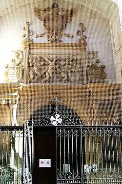 Dans une de ses extrémités on localise l'église. Le portail extérieur, ouvert dans la paroi ouest, est composé d'un arc en demi - pointe flanqué par deux paires de colonnes striées et adossées sous arquitrable listré. Sur la corniche, l'espace correspondant au fronton est occupé par un relief avec la scène du Christ sur le chemin du Calvaire, auquel sont flanqués des rouleaux avec les blasons héraldiques des Aguirre et des Esquível, et couronné par un blason impérial de Charles Quint. Le portail est protégé par une grille et une maille récemment intégrée, après sa restauration, pour la protéger des pigeons.