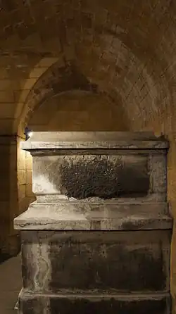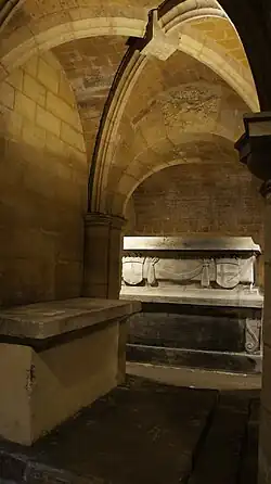 La crypte fait cinq mètres sur sept. Elle est structurée en trois nefs de deux travées. L'une de ces nefs a une voûte en berceau. Les deux autres sont dans un style gothique tardif, avec des voûtes d'ogive et pile centrale d'ordre toscan. Une voûte porte la date de 1662, date de fin d'aménagement.