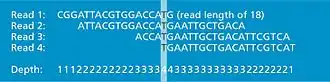 Ce nombre de lecture s'appelle donc la couverture (ou la profondeur) et représente le nombre de lectures uniques concernant un nucléotide donné dans la séquence reconstruite[1],[2]. Si une base est couverte par 30 séquences, elle aura donc une couverture (ou profondeur) de 30X.