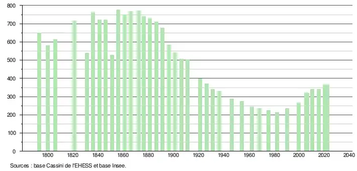 L'évolution du nombre d'habitants est connue à travers les recensements de la population effectués dans la commune depuis 1793. Pour les communes de moins de 10 000 habitants, une enquête de recensement portant sur toute la population est réalisée tous les cinq ans, les populations de référence des années intermédiaires étant quant à elles estimées par interpolation ou extrapolation[28]. Pour la commune, le premier recensement exhaustif entrant dans le cadre du nouveau dispositif a été réalisé en 2005[29].