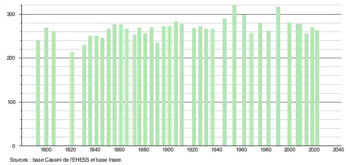 L'évolution du nombre d'habitants est connue à travers les recensements de la population effectués dans la commune depuis 1793. Pour les communes de moins de 10 000 habitants, une enquête de recensement portant sur toute la population est réalisée tous les cinq ans, les populations de référence des années intermédiaires étant quant à elles estimées par interpolation ou extrapolation[23]. Pour la commune, le premier recensement exhaustif entrant dans le cadre du nouveau dispositif a été réalisé en 2008[24].