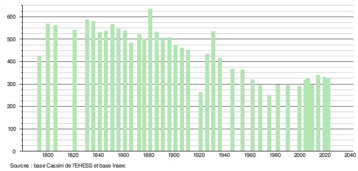 L'évolution du nombre d'habitants est connue à travers les recensements de la population effectués dans la commune depuis 1793. Pour les communes de moins de 10 000 habitants, une enquête de recensement portant sur toute la population est réalisée tous les cinq ans, les populations de référence des années intermédiaires étant quant à elles estimées par interpolation ou extrapolation[32]. Pour la commune, le premier recensement exhaustif entrant dans le cadre du nouveau dispositif a été réalisé en 2004[33].