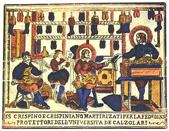 Crépin et Crépinien[4], venus de Rome, étaient chrétiens et cordonniers à Soissons. Ils fabriquaient des chaussures pour les pauvres, qu'ils ne faisaient pas payer, et pour les riches qui appréciaient leur production.