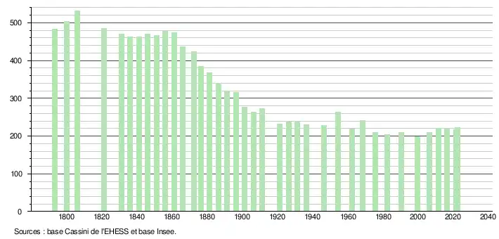 L'évolution du nombre d'habitants est connue à travers les recensements de la population effectués dans la commune depuis 1793. Pour les communes de moins de 10 000 habitants, une enquête de recensement portant sur toute la population est réalisée tous les cinq ans, les populations de référence des années intermédiaires étant quant à elles estimées par interpolation ou extrapolation[24]. Pour la commune, le premier recensement exhaustif entrant dans le cadre du nouveau dispositif a été réalisé en 2006[25].