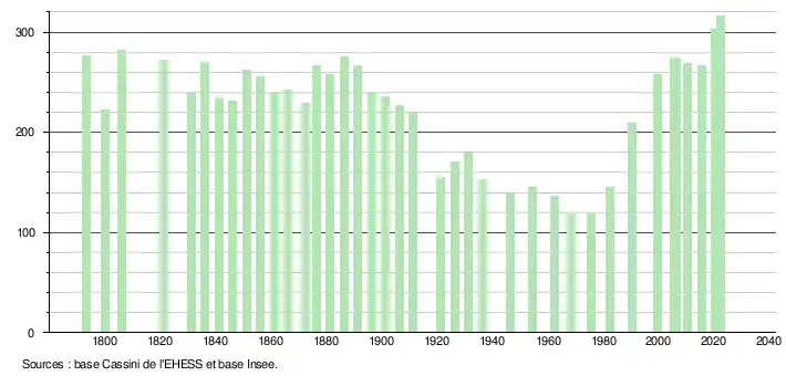 L'évolution du nombre d'habitants est connue à travers les recensements de la population effectués dans la commune depuis 1793. Pour les communes de moins de 10 000 habitants, une enquête de recensement portant sur toute la population est réalisée tous les cinq ans, les populations de référence des années intermédiaires étant quant à elles estimées par interpolation ou extrapolation[16]. Pour la commune, le premier recensement exhaustif entrant dans le cadre du nouveau dispositif a été réalisé en 2005[17].