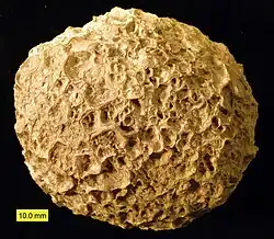 Structure "récifale" fossile, en boule, montrant bien comment la forme des coquilles peut chez l'huître - depuis longtemps - remarquablement bien épouser la forme des coquilles voisines (et inversement)