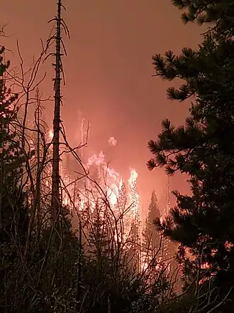 Au 9 septembre, au moins 60 maisons ont été détruites et 278 structures commerciales et résidentielles ont été détruites ainsi que l' historique Cressman's General Store, un monument remarquable local[11]. Le 9 septembre, le feu a atteint des explosifs entreposé au China Peak Mountain Resort, qui ont été utilisés pour contrôler les avalanches, provoquant l'explosion de la cache. Les pompiers avaient été avertis de la cache et évacués avant que l'incendie n'atteigne les matières explosives[12].